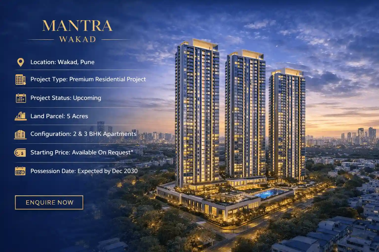 Mantra Wakad is a new residential project by Mantra Properties, located in Wakad, Pune. Spread over 5 acres, it will offer well-designed 2 and 3 BHK homes. Wakad is a popular residential area known for its good connectivity and calm surroundings.